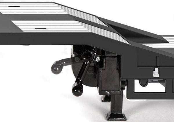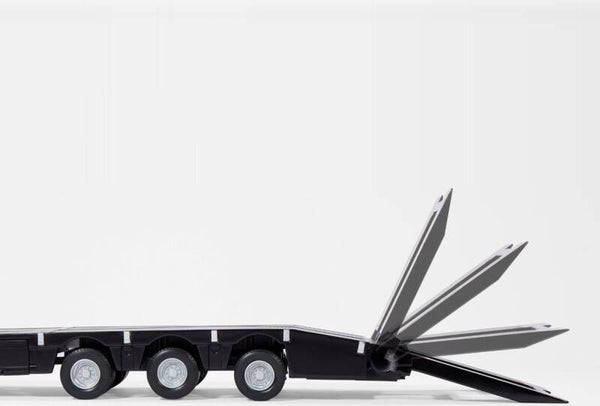 Besonders schwere Fracht wie Baumaschinen, Traktoren oder Brückenteile zu transportieren, geht nur mit einem speziellen Tieflader. Die EURO-Tieflader des niederländischen Herstellers Nooteboom gelten als die Robustesten am Markt. Dank der hydraulischen Lenkung lassen sich die schweren Spezialtransporter außerdem ausgezeichnet manövrieren. Dem Eurotrailer von Nooteboom ist auch der 3-Achs-Tieflader von siku nachempfunden. Der Auflieger hat die Form eines tiefen Bettes, am Heck befindet sich eine elektronische Rampe, um die schwere Last leichter verladen zu können. Das Fahrgestell des Tiefladers ist aus Metall, der Aufbau auf Kunststoff. Für zusätzliche Stabilität im Stand lassen sich Stützfüße manuell ausfahren. Am Heck des Aufliegers befinden sich vier LEDs: zwei Fahrlichter in Rot sowie zwei Blinker. Per Kabel mit Klinkenstecker wird der Tieflader mit der entsprechenden Bluetooth-Zugmaschine aus der SIKU CONTROL-Reihe verbunden, wie etwa einem LKW oder Traktor. Diese wiederum kann ganz einfach per SIKU CONTROL-App oder passendem Fernsteuermodul navigiert werden.