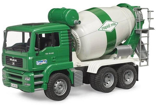 De Bruder speelgoed MAN TGA betonwagen is een stoere vrachtwagen met een aantal werkende functies. Zo kan de cabine van deze Bruder MAN TGA vrachtwagen met betonmixer gekanteld worden zodat je een blik op het motorblok van de vrachtwagen kan werpen. Ook is de trommel van de betonwagen te draaien met een draaiknop. Als je de trommel van de betonvrachtwagen vult met zand of water, kun je het door de trommel middels de knop te draaien het er via de glijbaan echt uit laten komen. Ook de watertank van de betonmolen kan gevuld worden met water, zodat je dat er met de slang weer uit kunt laten lopen of het bijgeleverde emmertje ermee kunt vullen. De wielen van de Bruder betonvrachtwagen zijn gemaakt van zacht rubber met echt straatprofiel. Alle Bruder vrachtwagens zijn gemaakt op dezelfde schaal, zodat de diverse Bruder producten goed met elkaar zijn te combineren. Kijk bijvoorbeeld ook eens bij de Bruder speelfiguren.