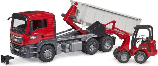 Met deze set voertuigen kun je je kind spelenderwijs het dagelijkse leven van een bouwvakker laten ervaren. De MAN TGS vrachtwagen heeft een afrolcontainer en een Schäffer landbouwlader. De cabine, met openslaande deuren en splintervrije ramen, simuleert een moderne werkplek. De container heeft scharnierende deuren en kan worden vastgepakt met de grijparm.