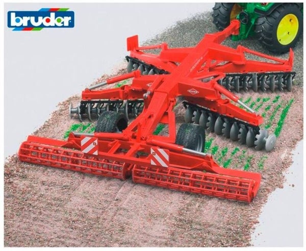 Deze grote ploeg heeft 54 spinnen schijven voor maximaal oppervlak! De schijven zitten aan vier frames bevestigd. Daarna beschikt hij over twee rollen die omhoog geklapt kunnen worden zodat je er ook mee over de weg kan rijden. De ploeg is gemakkelijk te koppelen aan een van de Bruder vrachtwagens of tractoren.