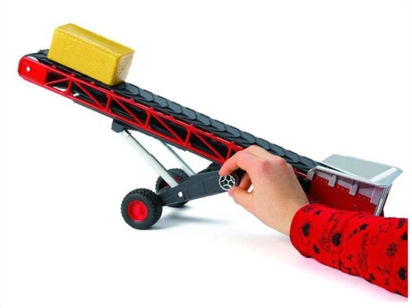Bruder Transportband. In perfect gedetailleerd en origineelgetrouw design. De transportband is voorzien van een in hoogte verstelbaar chassis, een opklapbare dissel, handgedreven beweging van de rubberen band en een v-vormige rubberen band met dwarsstrepen. De dissel kan worden gekoppeld aan vrachtwagens en tractoren met trekhaak. Transporthoogte: 110 tot 310 mm. Schaal 1:16. Afmetingen: ca. L 54,3 x B 13,3 x H 31 cm.