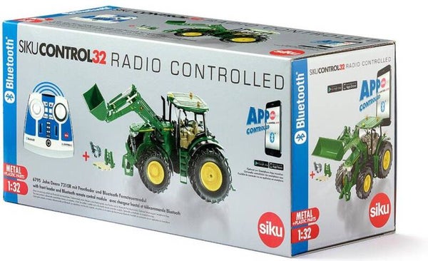 De via bluetooth op afstand bestuurbare John Deere 7310R tractor met voorlader is een innovatieve toevoeging aan het assortiment van Siku Control.
