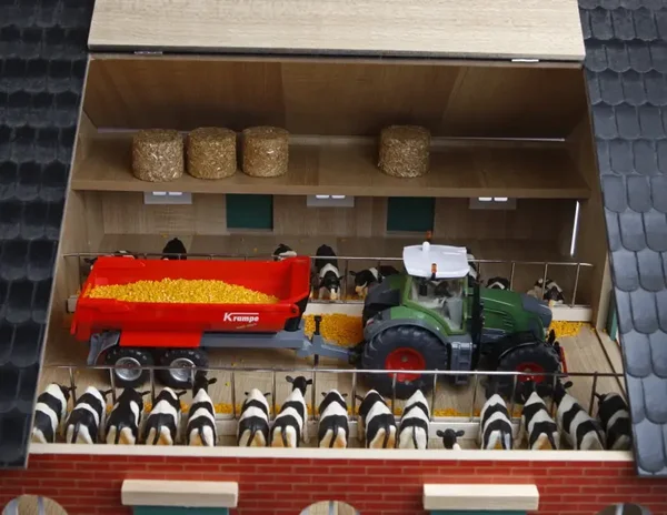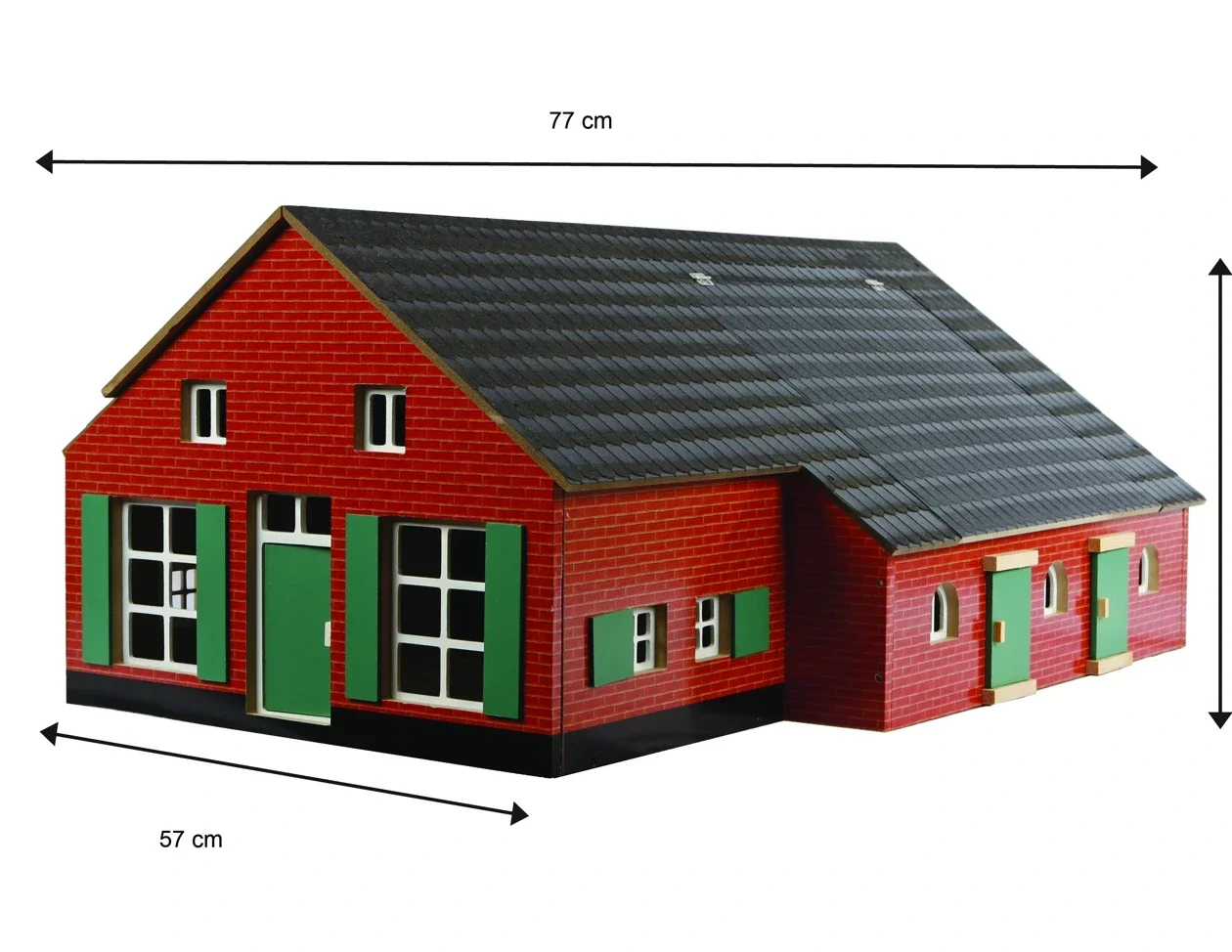In deze Boerderij met Woonhuis en Stal zou je toch willen wonen. Het woongedeelte kan geopend worden door de voorpui open te schuiven. Het woongedeelte heeft 1 kamer met trap die naar de zolder leidt. Via de deur in het woongedeelte kom je in de grote stal.Het dak kan door middel van een klep open zodat je ook zo bij de stal kunt. Verder hebben de woonboerderij en de stal nog raampjes die open- en dicht kunnen. Aan de achterkant van de stal zijn er 2 grote schuifdeuren waar trekkers door naar buiten en binnen kunnen rijden, ook heeft de stal een zolder om bijvoorbeeld hooibalen op te bergen. De woonboerderij en stal zijn gemaakt van solide hout, bevatten kleine details en zien er hierdoor levensecht uit. Schaal 1:32. Wordt geleverd zonder accessoires.