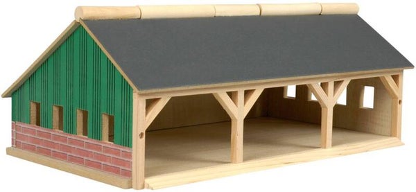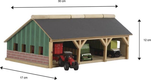 Mooie houten landbouwloods. In de loods kun je tractors en landbouwmachines stallen. Het dak kan open zodat je makkelijk met de loods kan spelen. De loods is geschikt voor de kleine Siku tractors. Schaal 1:87.